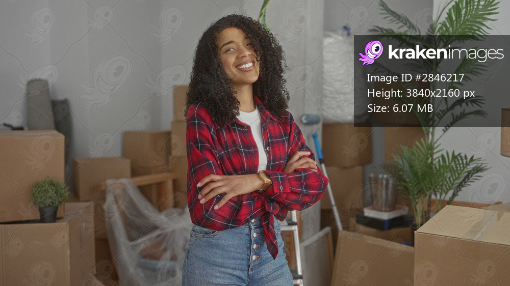 African american woman wearing a red flannel shirt crosses her arms amid stacked cardboard boxes in a modern office building; denial.
