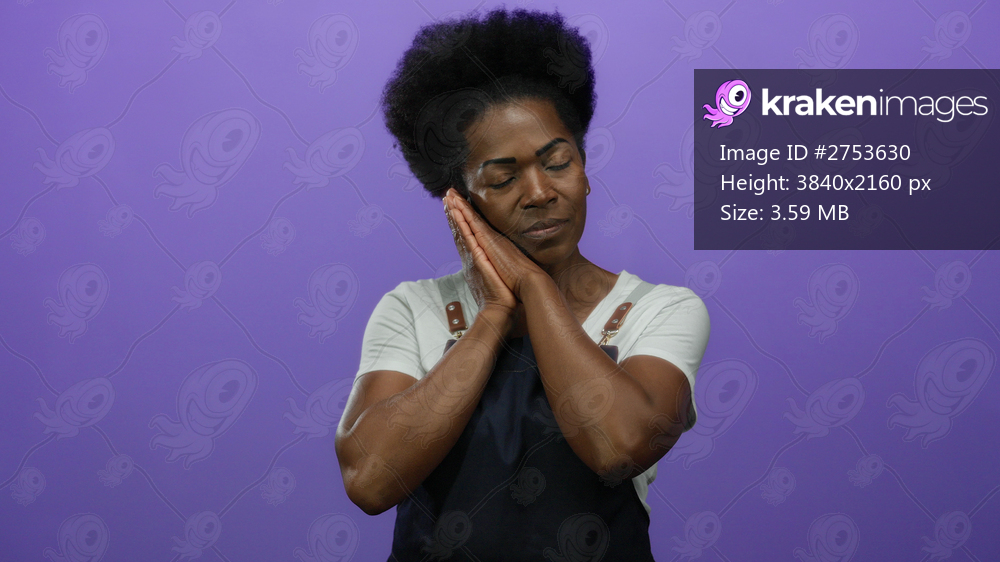 African american woman wearing apron makes sleeping gesture isolated over purple background, suggesting tiredness in a peaceful setting.