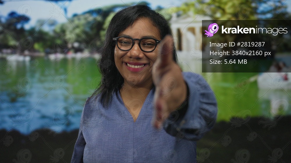 African american woman wearing blue blouse and glasses extends hand for handshake before building entrance; trust.