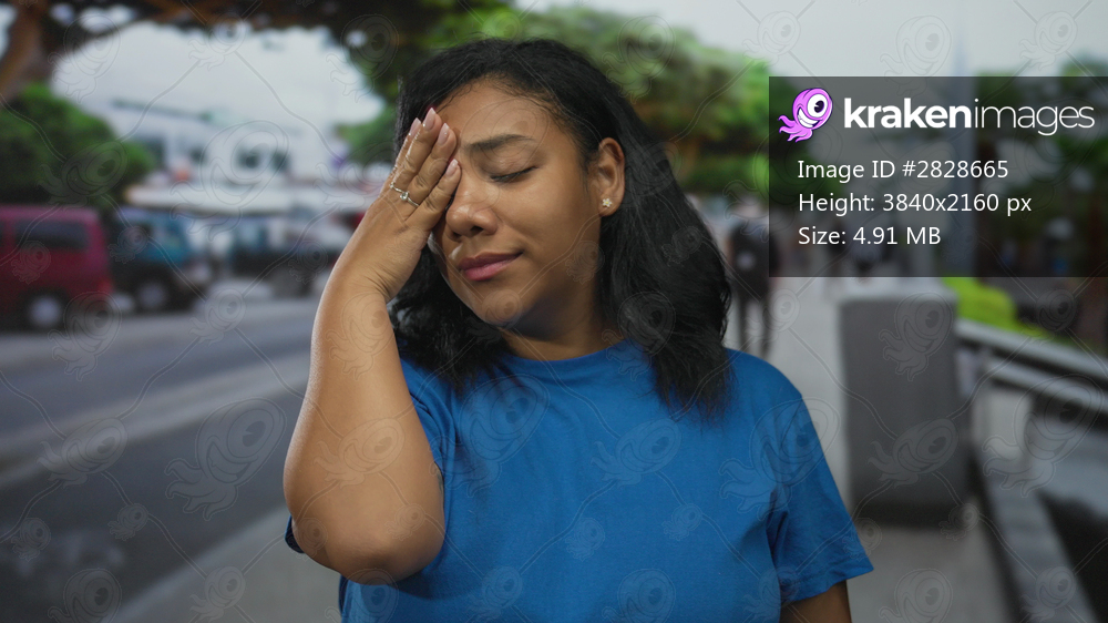 African american woman wearing blue shirt presses hand to forehead in street; stress fatigue headache frustration.