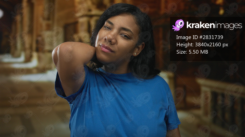 African american woman wearing blue shirt touches neck in church building; discomfort solitude introspection.