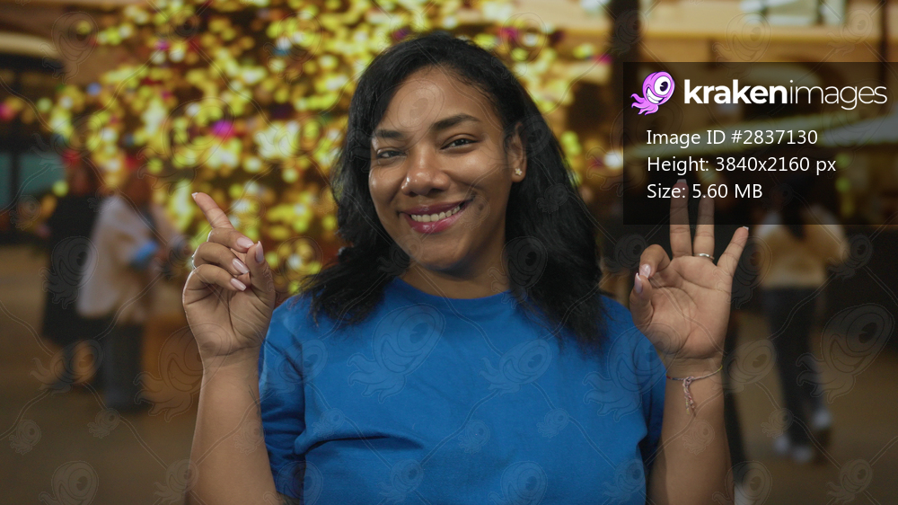 African american woman wearing blue shirt waves hand and points finger in street market; friendly welcome joy warmth.