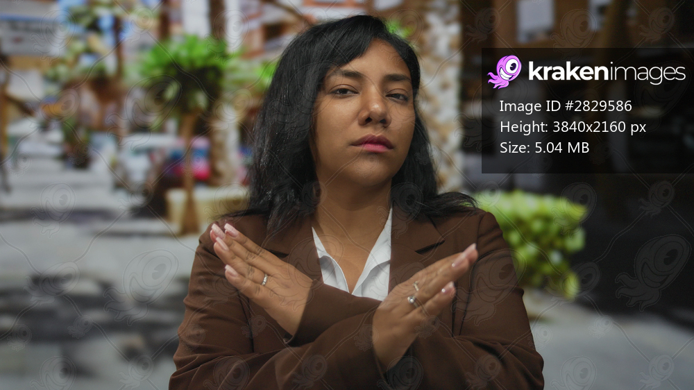 African american woman wearing brown blazer crosses arms on urban street with blurred building facades behind her; rejection.
