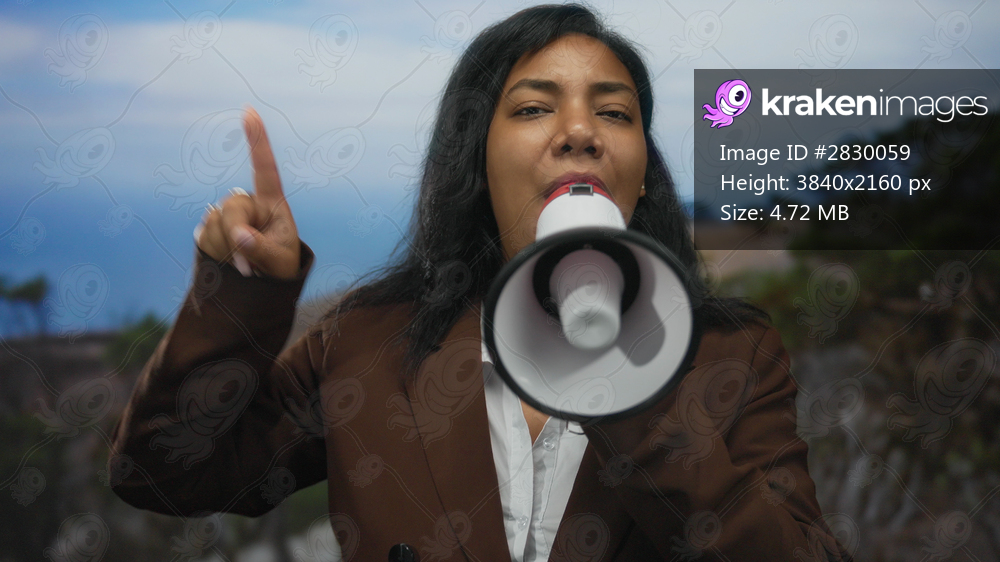 African american woman wearing brown blazer holds megaphone and points finger in forest clearing; determination.