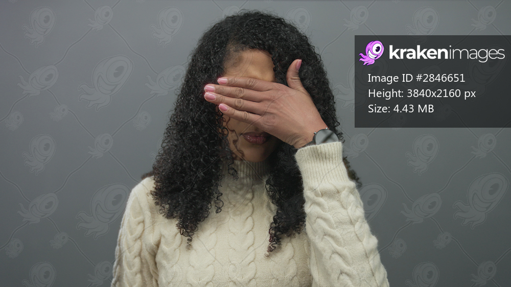 African american woman wearing cable knit sweater rests hand on forehead in grey studio; stress fatigue discomfort.