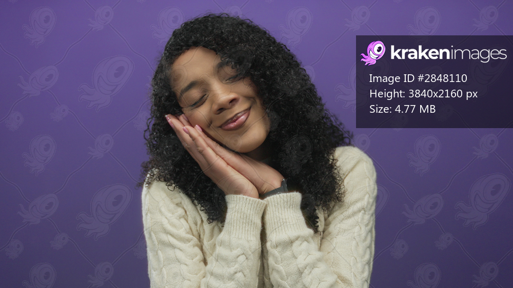 African american woman wearing cable knit sweater smiling hand to cheek against purple wall in studio; serenity calm reflection.