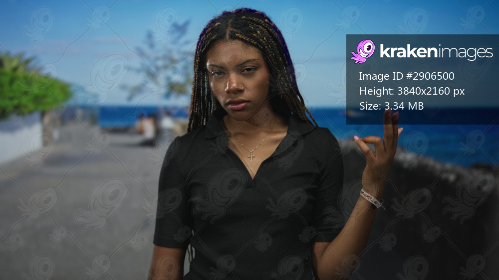 African american woman wearing cross necklace standing on promenade by the seaside; contemplation calm.