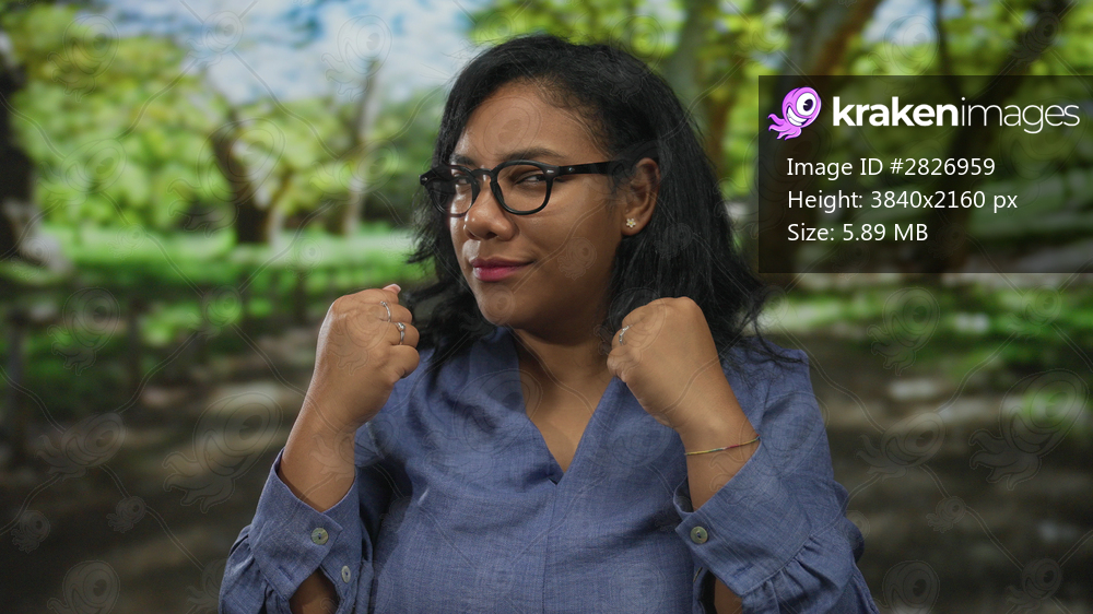 African american woman wearing glasses and blue shirt holds fists up in forest park; confidence empowerment.