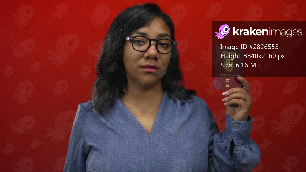African american woman wearing glasses holding finland passport in studio against red wall; confidence identity travel.