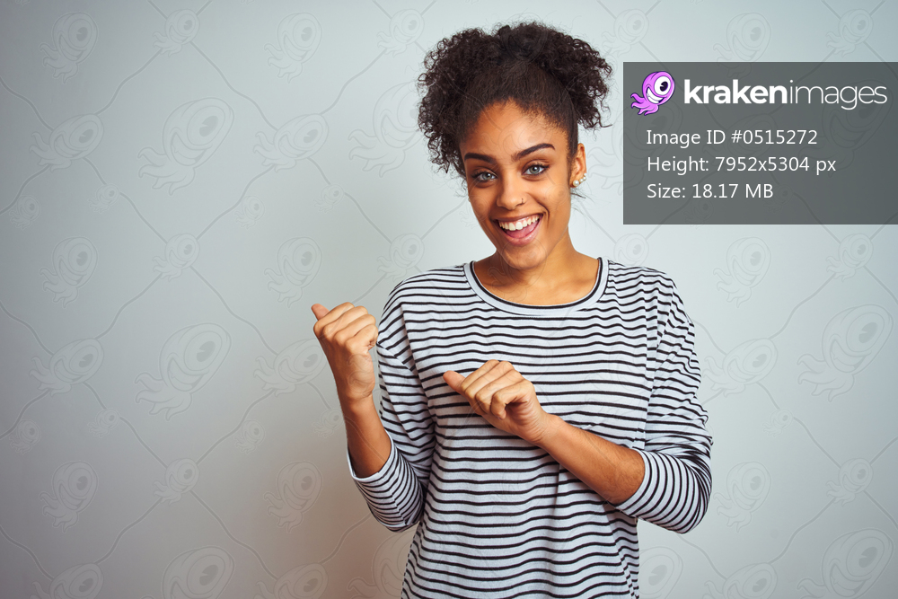 African american woman wearing navy striped t-shirt standing over isolated white background Pointing to the back behind with hand and thumbs up, smiling confident - Kraken Images