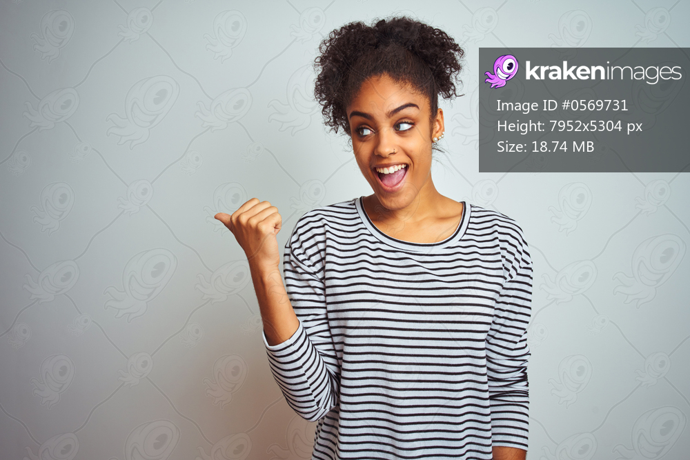 African american woman wearing navy striped t-shirt standing over isolated white background smiling with happy face looking and pointing to the side with thumb up. - Kraken Images