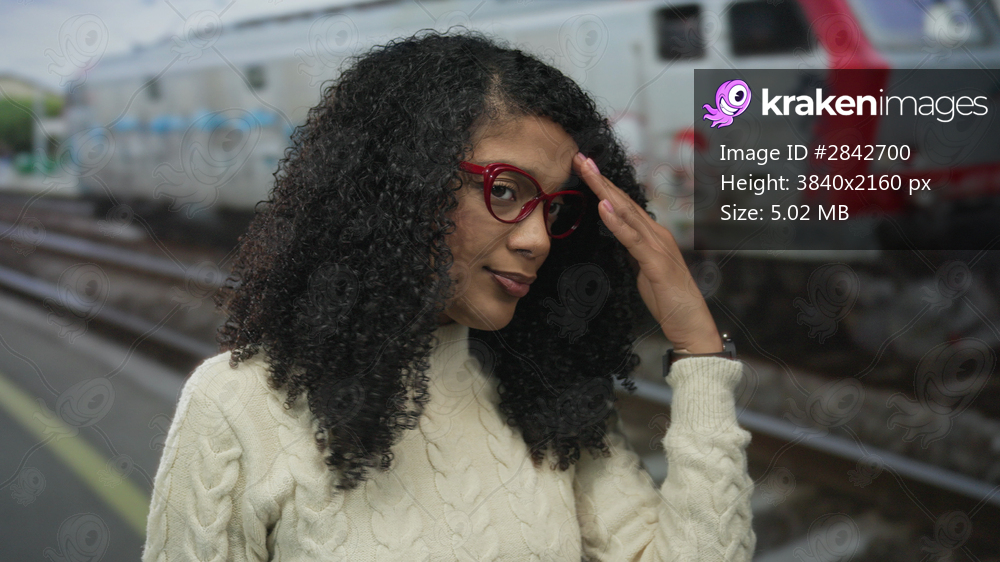 African american woman wearing red glasses and cableknit sweater shields eyes at railway platform building; anticipation.