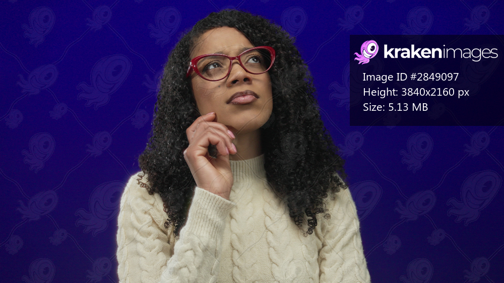 African american woman wearing red glasses touching chin with finger in studio blue background; thoughtful reflection.