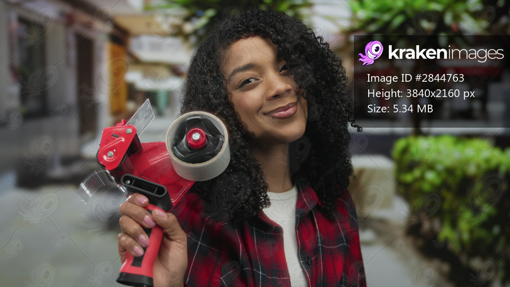 African american woman wearing red plaid shirt holds skateboard while smiling on urban street; playful confidence.