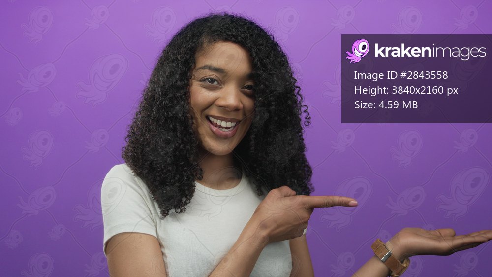 African american woman wearing white shirt points finger to open palm with a watch in studio; encouragement positivity.