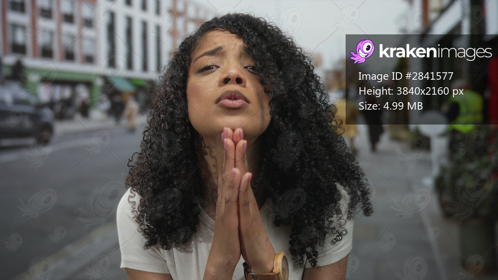 African american woman wearing white t shirt with clasped hands showing prayer on a city street by buildings; hope plea.