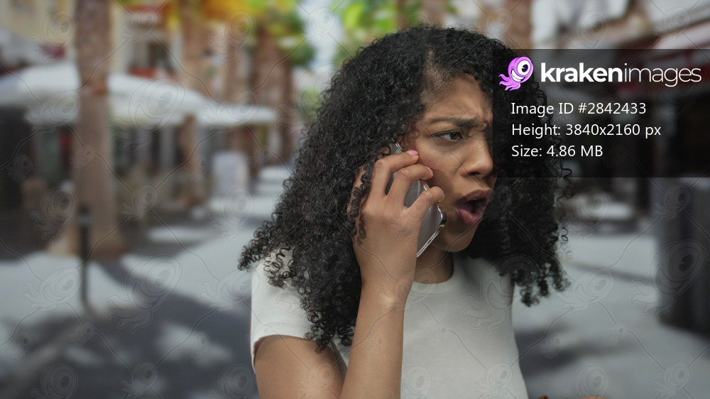African american woman wearing white t shirt holds smartphone to ear while gesturing with free hand on city street under sunlight; frustration.