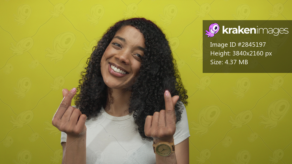 African american woman wearing white tshirt and wooden watch makes finger heart gesture and smiles broadly in studio;affection joy.