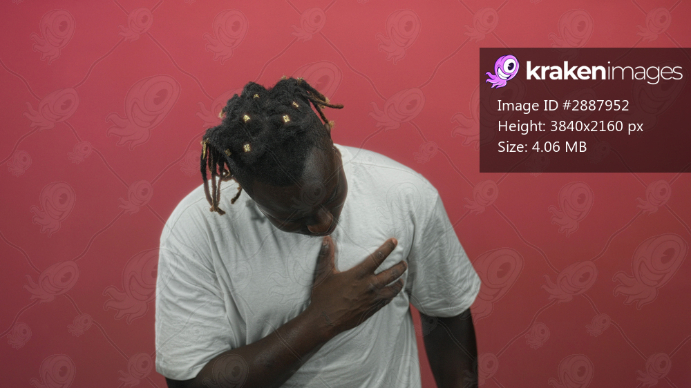 African american young man in white t shirt with hand on chest and eyes closed in pink studio under soft lighting; contemplation.
