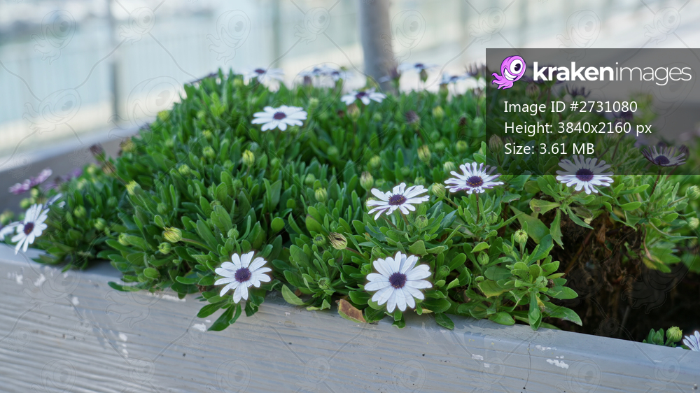 African daisies blooming in a sunlit outdoor setting in torrevieja, spain, showcasing vibrant greenery and tranquil coastal background colors.
