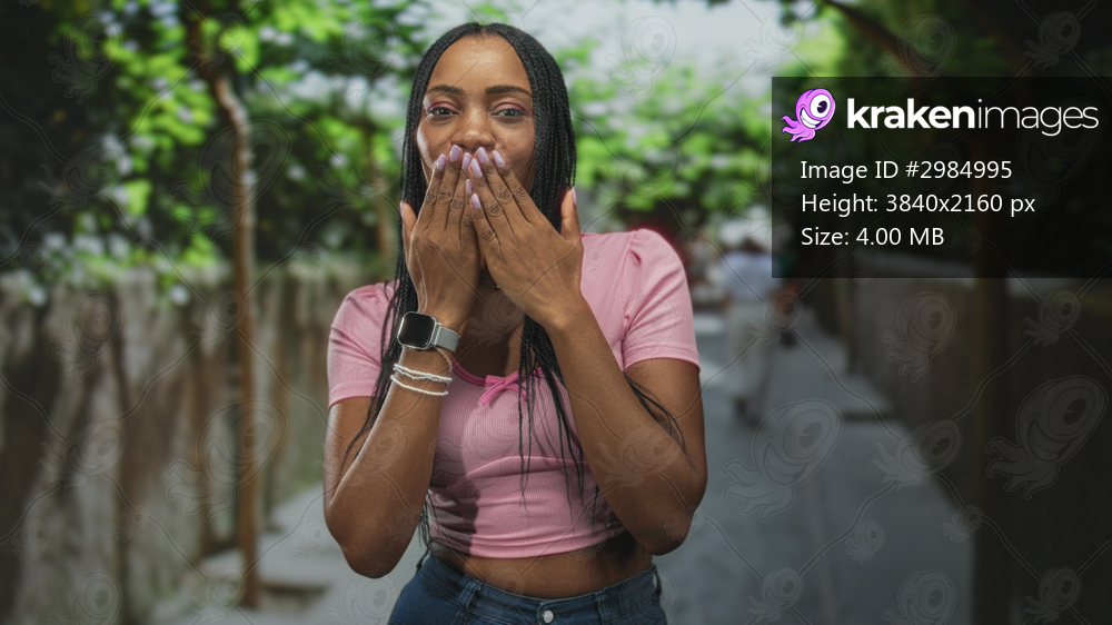 African woman blowing kiss with hands and smartwatch, pink crop top on tree lined street; affection connection.