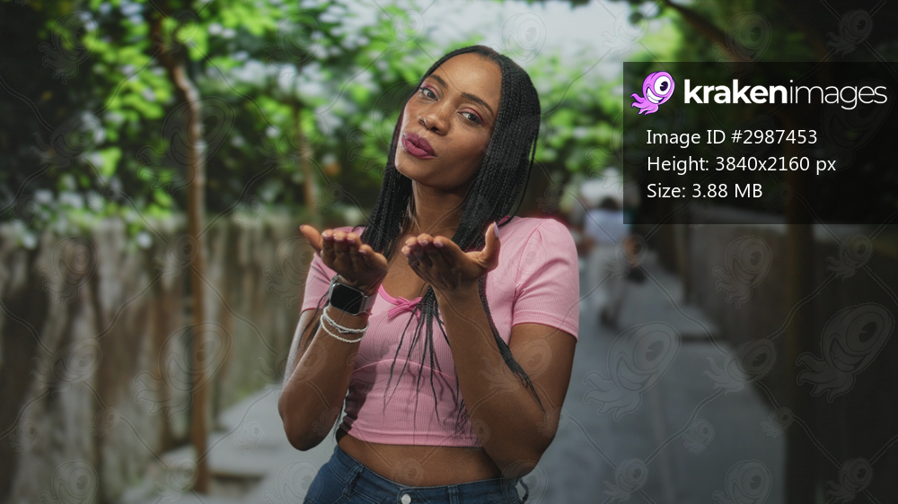 African woman blowing kiss with hands and smartwatch, pink crop top on tree lined street; affection connection.