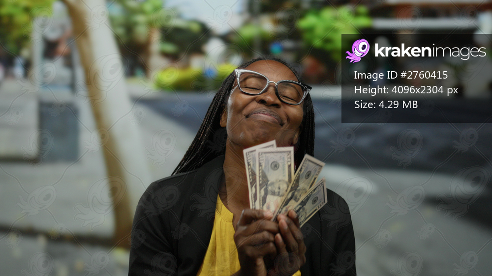 African woman with curly hair smiling and holding us dollars outdoors in an urban city street, expressing happiness and confidence.