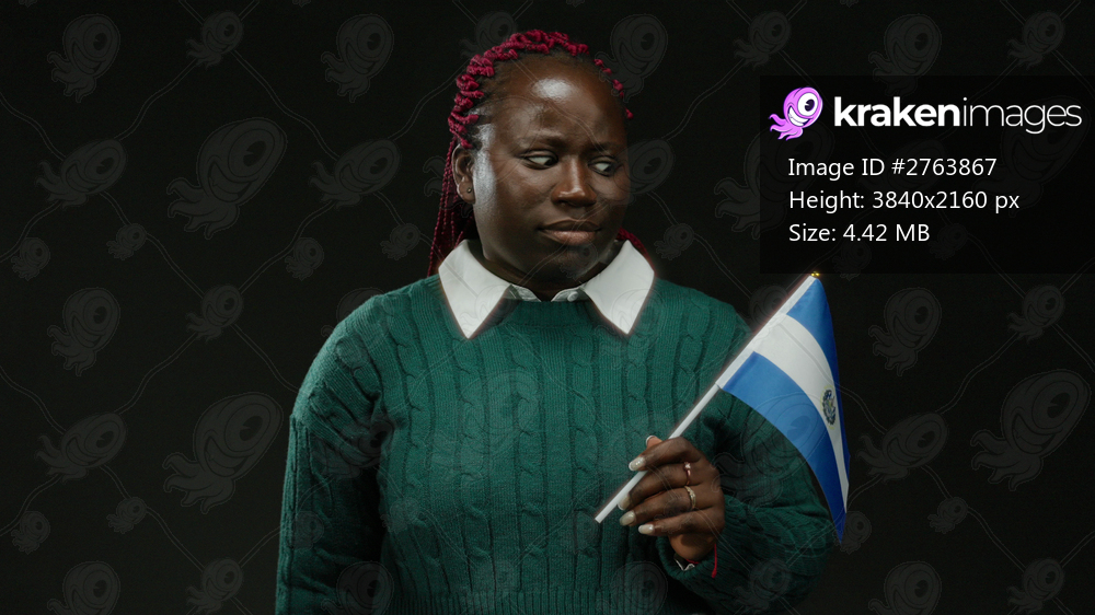 African woman holding el salvador flag with a curious expression posing against an isolated black background.