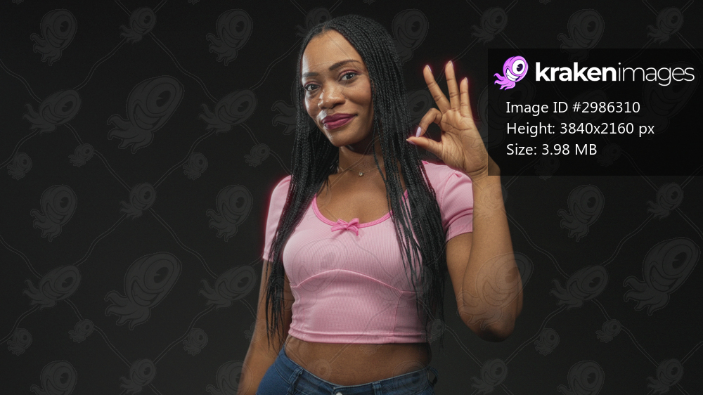 African woman makes ok hand sign showing hand and midriff, wearing pink crop top and jeans with braided hair against black studio backdrop; confidence approval. - Kraken Images