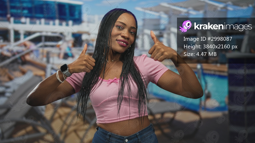 African woman showing midriff and giving thumbs up at pool deck, smiling to camera; joy vacation confidence.