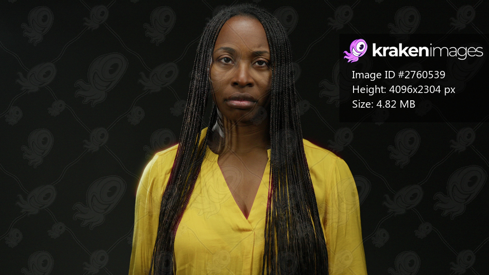 African woman wearing yellow shirt stands against a dark background, showcasing her braided hairstyle with a serious expression.