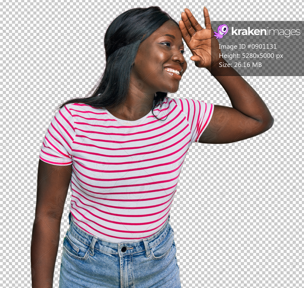African young woman wearing casual striped t shirt very happy and smiling looking far away with hand over head. searching concept.