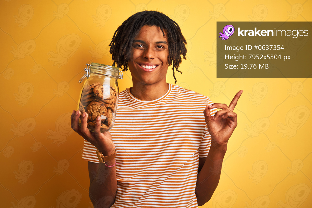 Afro american man with dreadlocks holding jar of cookies over isolated yellow background very happy pointing with hand and finger to the side