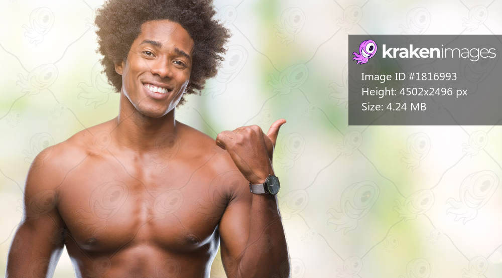 Afro american shirtless man showing nude body over isolated background smiling with happy face looking and pointing to the side with thumb up.