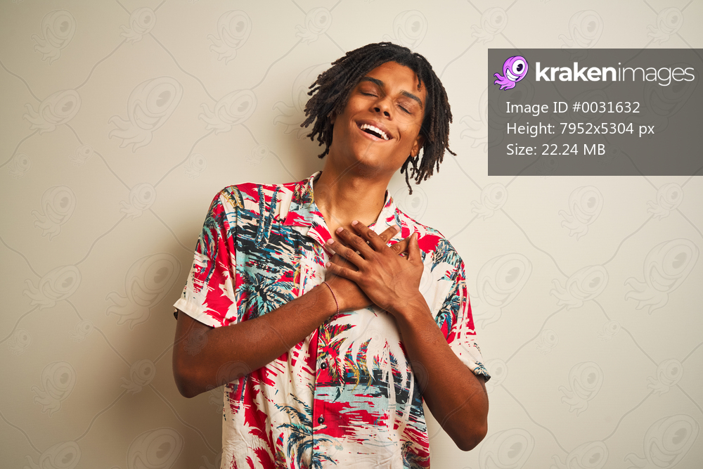 Afro man with dreadlocks on vacation wearing summer shirt over isolated white background smiling with hands on chest with closed eyes and grateful gesture on face. Health concept. - Kraken Images