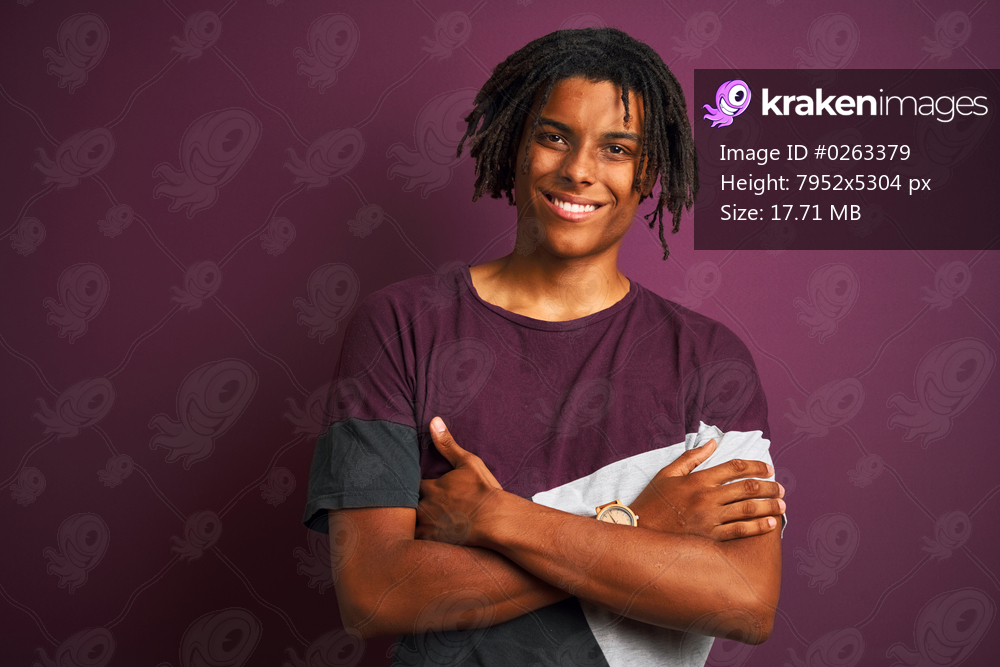 Afro man with dreadlocks wearing casual t-shirt standing over isolated purple background happy face smiling with crossed arms looking at the camera. Positive person. - Kraken Images