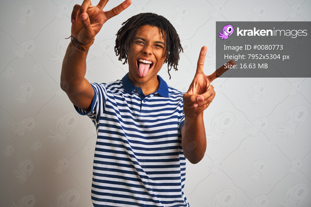 Afro man with dreadlocks wearing striped blue polo standing over isolated white background smiling with tongue out showing fingers of both hands doing victory sign. Number two. - Kraken Images