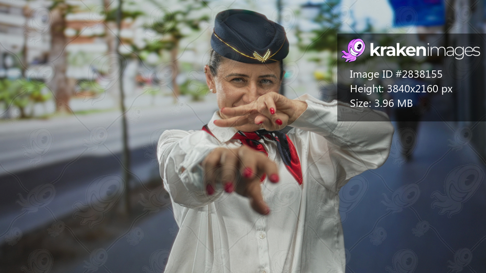 Air hostess in white blouse and navy cap pointing fingers forward to camera on bustling city street lined with trees; playful confidence.