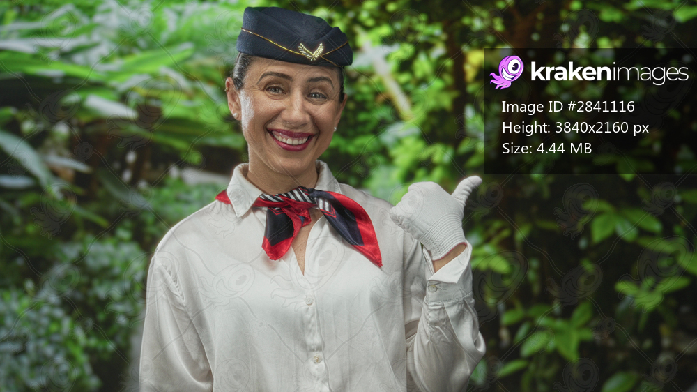 Air hostess woman wearing navy hat, white shirt and gloves with silk scarf points thumb to side in forest; warm welcome.