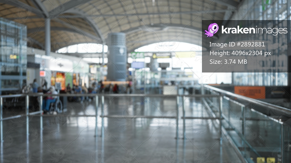 Airport terminal scene in soft blurred bokeh, empty transit hall and railings suggest open concourse station; background backplate copyspace.