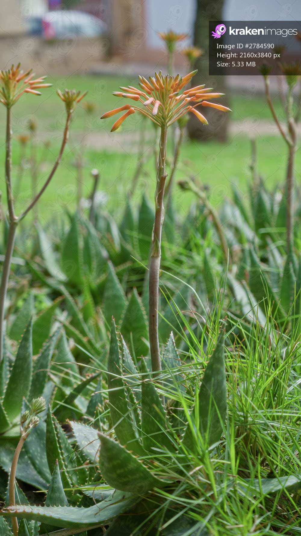 Aloe vera plant with spiky leaves and orange flowers growing outdoors in sunny torrevieja, spain, amidst a green lawn setting.