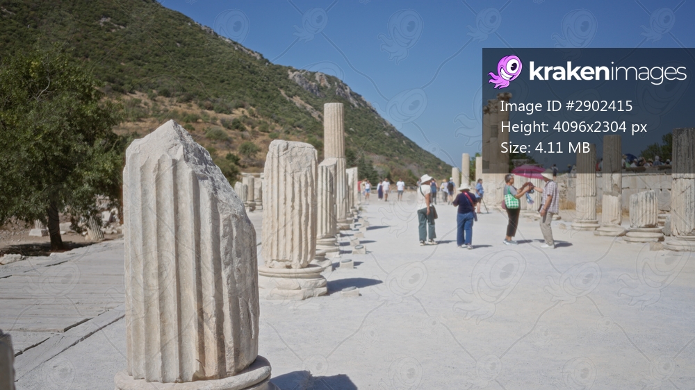 Ancient marble columns in sharp foreground with blurred ruins and shallow focus in outdoor; background backplate template calm.