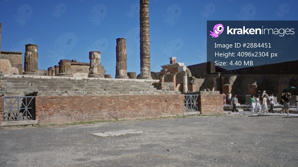 Ancient roman columns and weathered brick wall captured soft defocused in a sunlit plaza with open sky; background backplate template calm.
