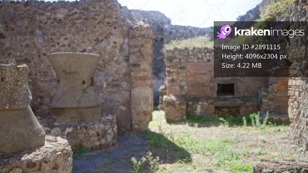 Ancient stone and brick ruins, shallow defocused sunlit weathered courtyard outdoor; background copyspace backplate.