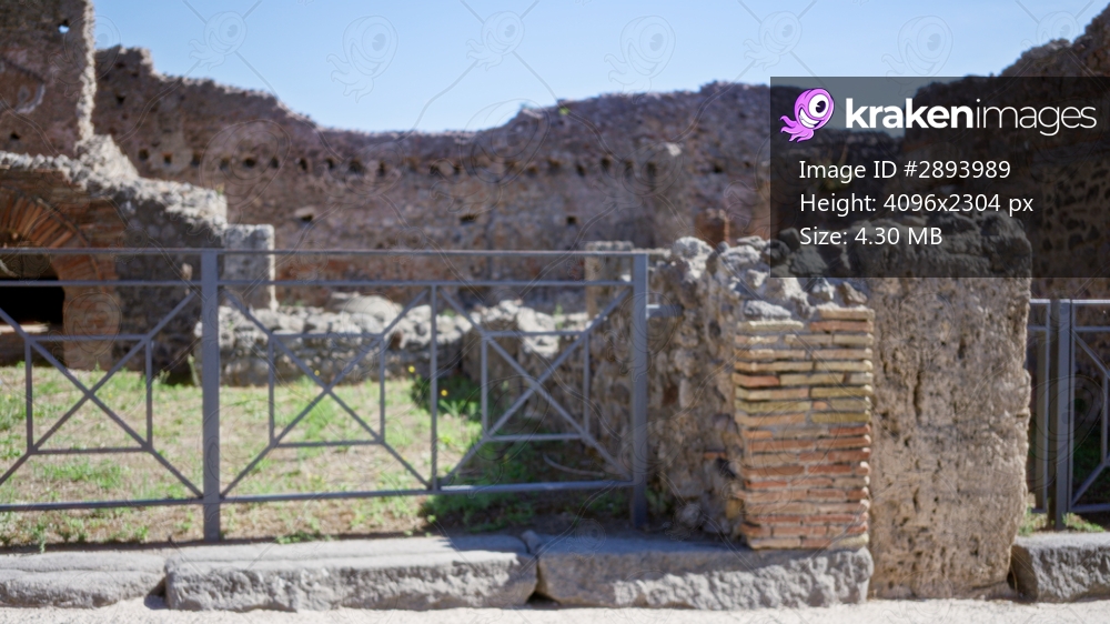 Ancient stone ruins with a defocused shallow bokeh background outdoor, weathered brick and metal fence in foreground suggesting historic site; background backplate copyspace template. - Kraken Images