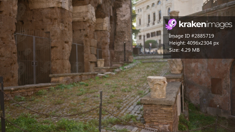 Ancient stone ruins with cobblestone pathway in soft defocused blur outdoor; template overlay virtual production.