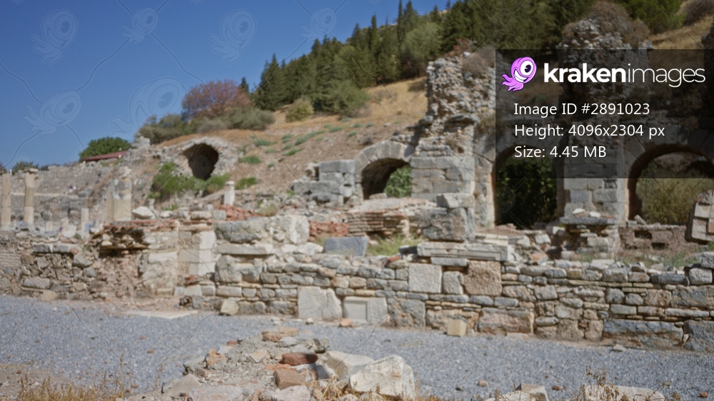 Ancient stone ruins with defocused shallow focus and soft bokeh in an outdoor hillside setting; backplate template overlay calm.