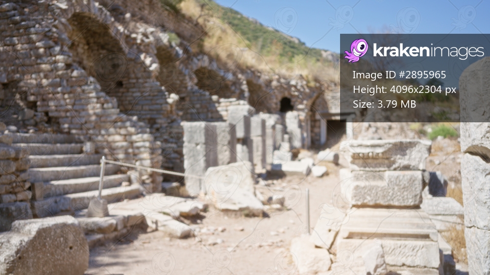 Ancient stone ruins and scattered columns in a soft defocused outdoor background showing weathered steps and arches; background backplate copyspace calm. - Kraken Images