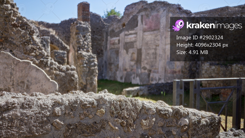 Ancient stone ruins with sharp foreground texture and defocused distant frescoes, soft bokeh outdoor; background backplate copyspace calm.