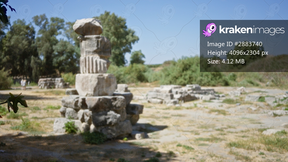 Ancient stone ruins softly defocused with shallow bokeh, sunlit column and scattered blocks in an outdoor park; background backplate copyspace calm.